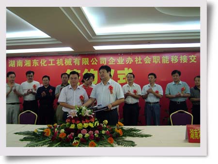 10月10日,湖南湘東化工機械有限公司企業辦社會職能移交攸縣人民政府簽約儀式在海悅國際大酒店舉行。會議由省石化行業管理辦公室主持,省石化行業管理辦公室副主任方忠、改制辦處長唐輝島,株洲市勞動局副局長李國華,湘東化機董事長兼總經理蘇成、黨委書記林德晁、副總經理姜衡陽、副總師兼改制辦主任陽炳伏,攸縣縣委書記鄺鄒飛,攸縣縣委副書記、縣長胡湘之,攸縣各職能部門領導出席了會議。