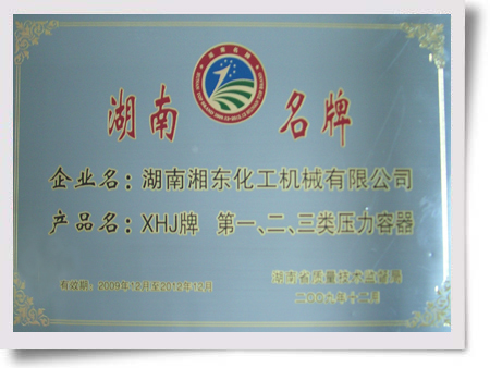 2009年12月,湖南湘東化工機械有限公司的產品名“XHJ牌,第一、二、三類壓力容器”被湖南省質量技術監督局授予“湖南名牌”稱號。(王慧卉)